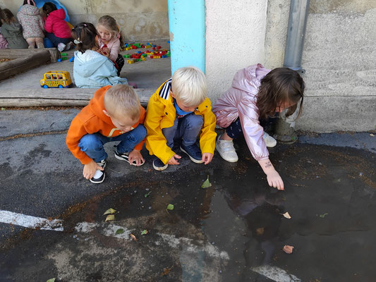 Après l'averse, quel plaisir que de jouer avec l'eau (là où une simple feuille devient un petit bateau !) !