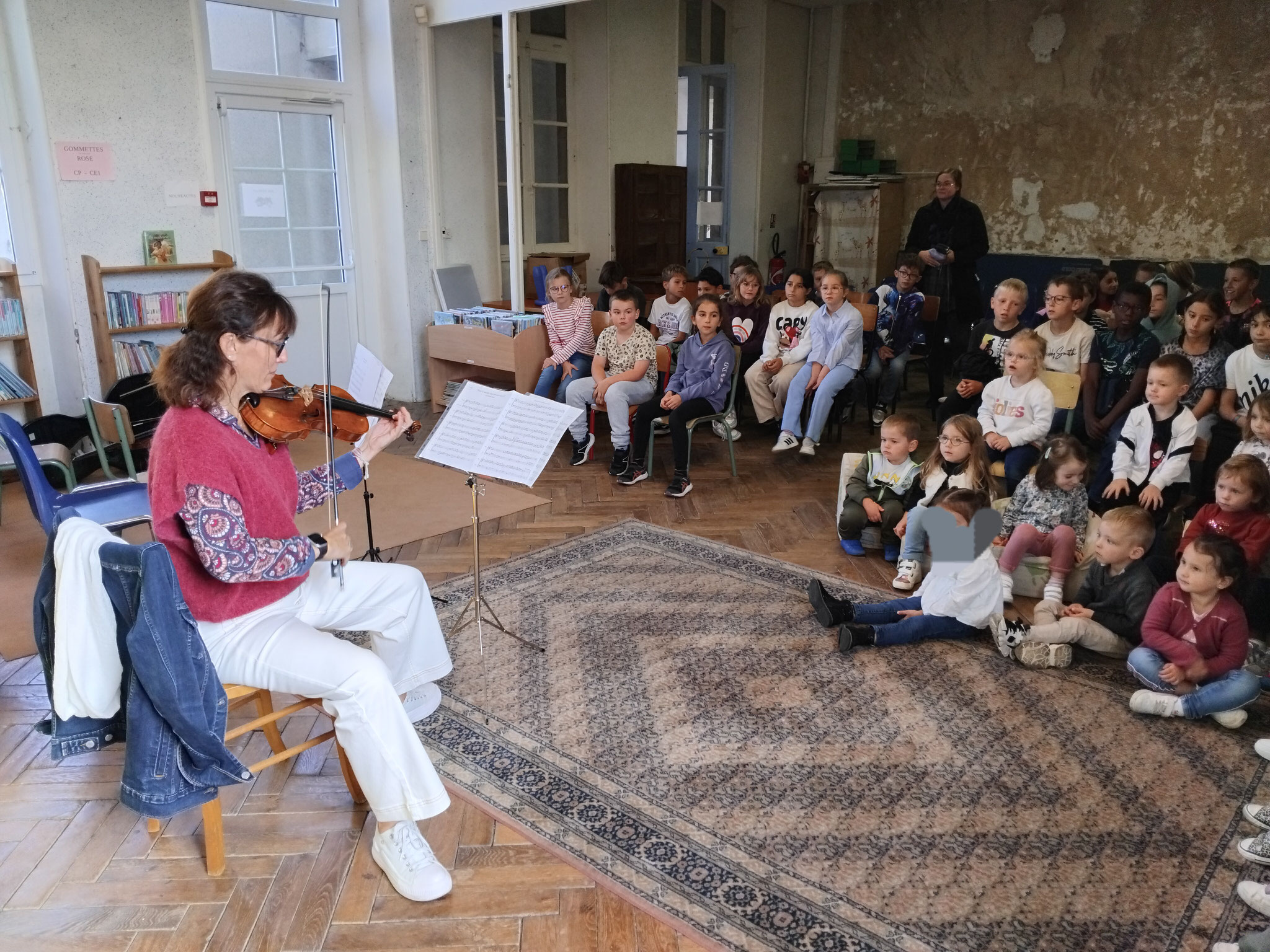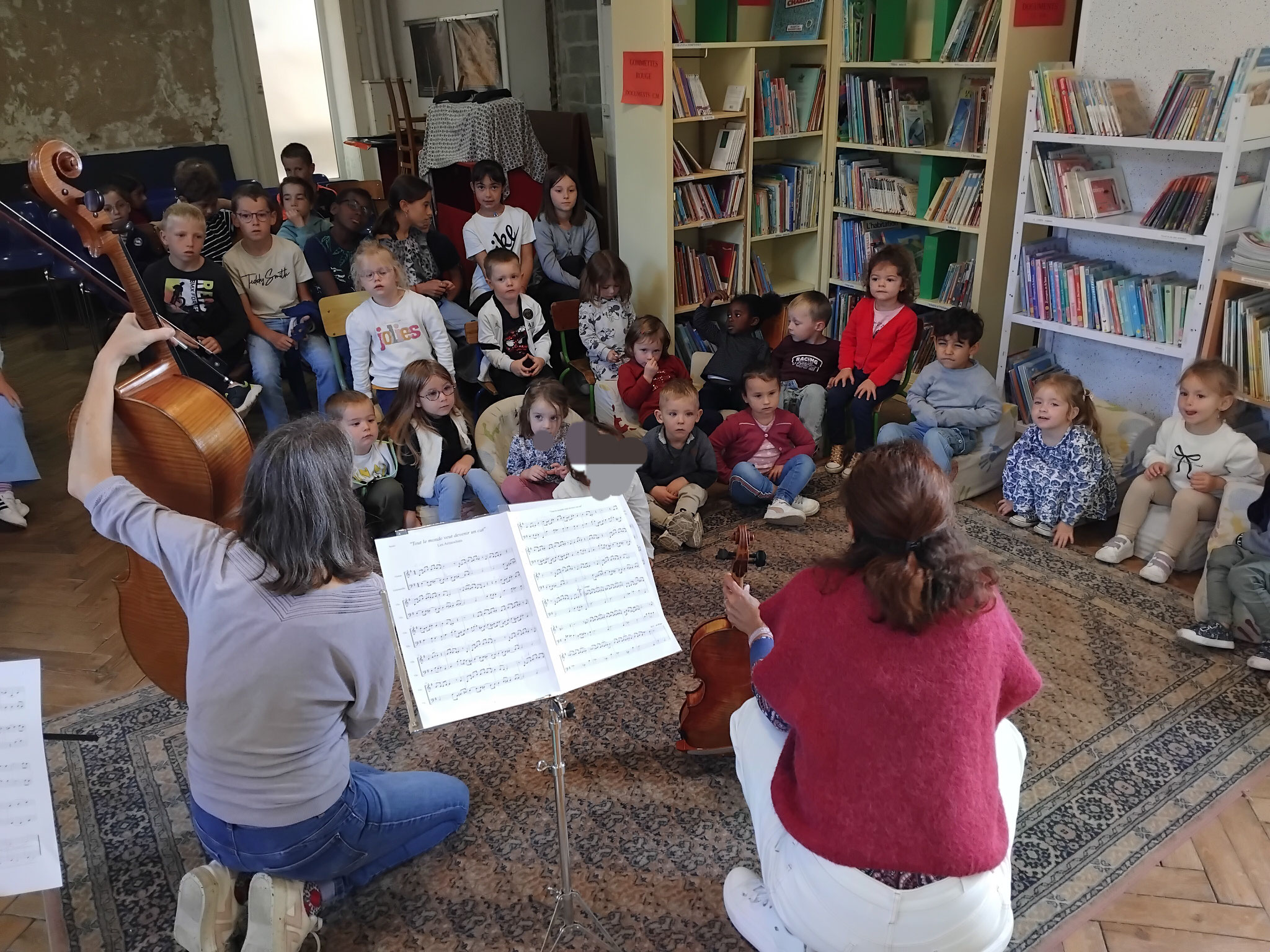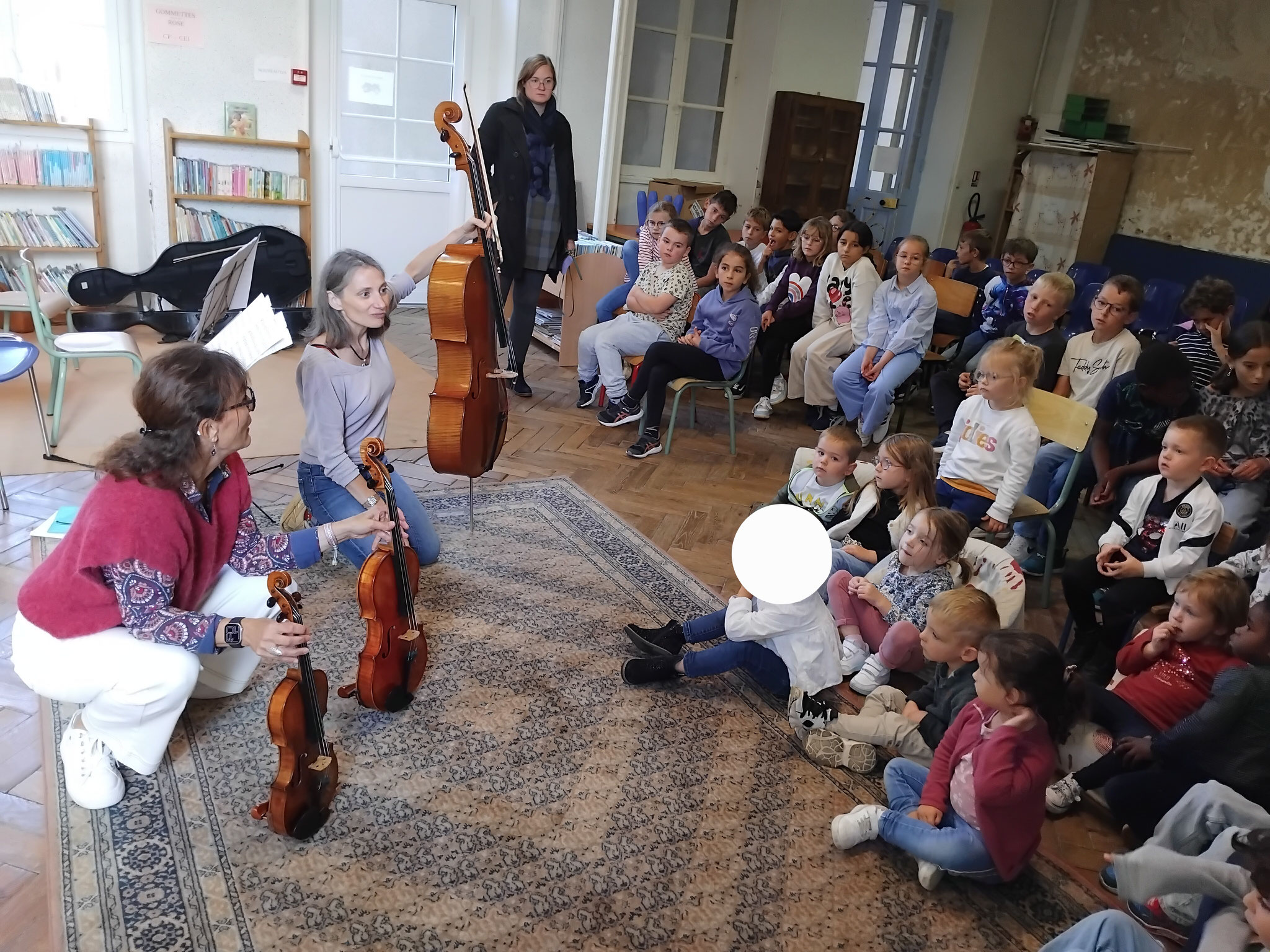 Aujourd'hui, tous les élèves de l'école ont pu assister à une présentation d'instruments par des professeur(e)s de l'école de musique. Au programme pour nos PS-MS : du violon, du violon "alto" et du violoncelle !