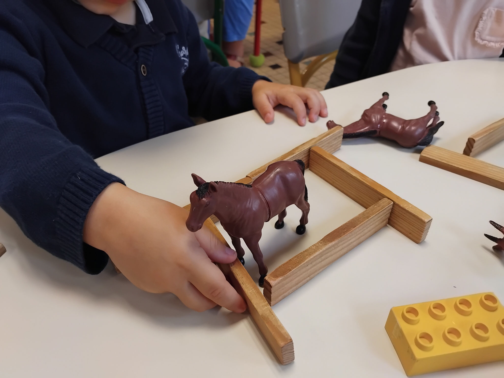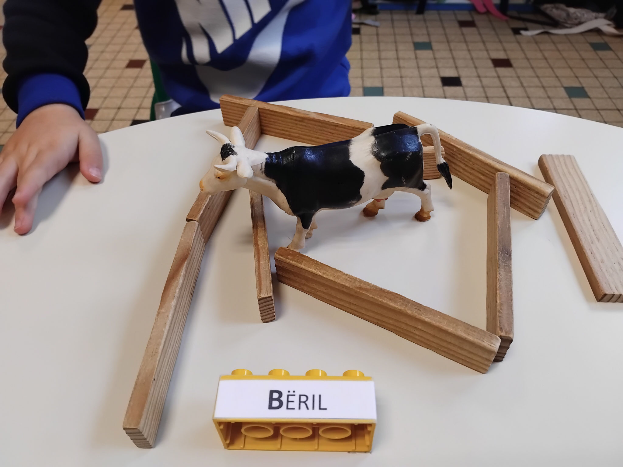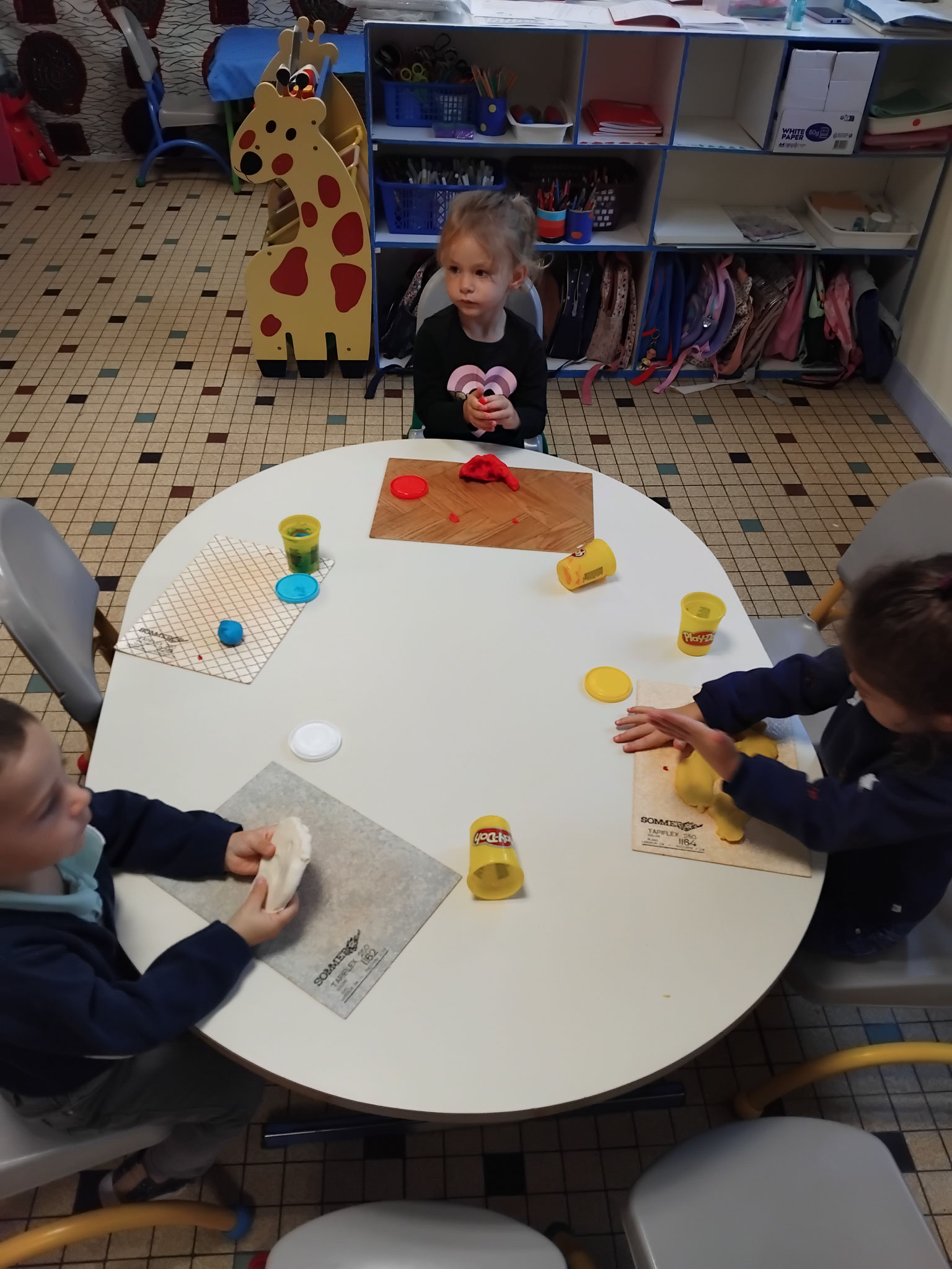 Au programme (entre autres) ce jour : apprendre à réaliser une boule en pâte à modeler (PS) pour muscler sa main et travailler la motricité fine, travail de la quantité "1" '(1 animal dans 1 enclos - PS), reproduction d'un modèle en Kapla (MS)...