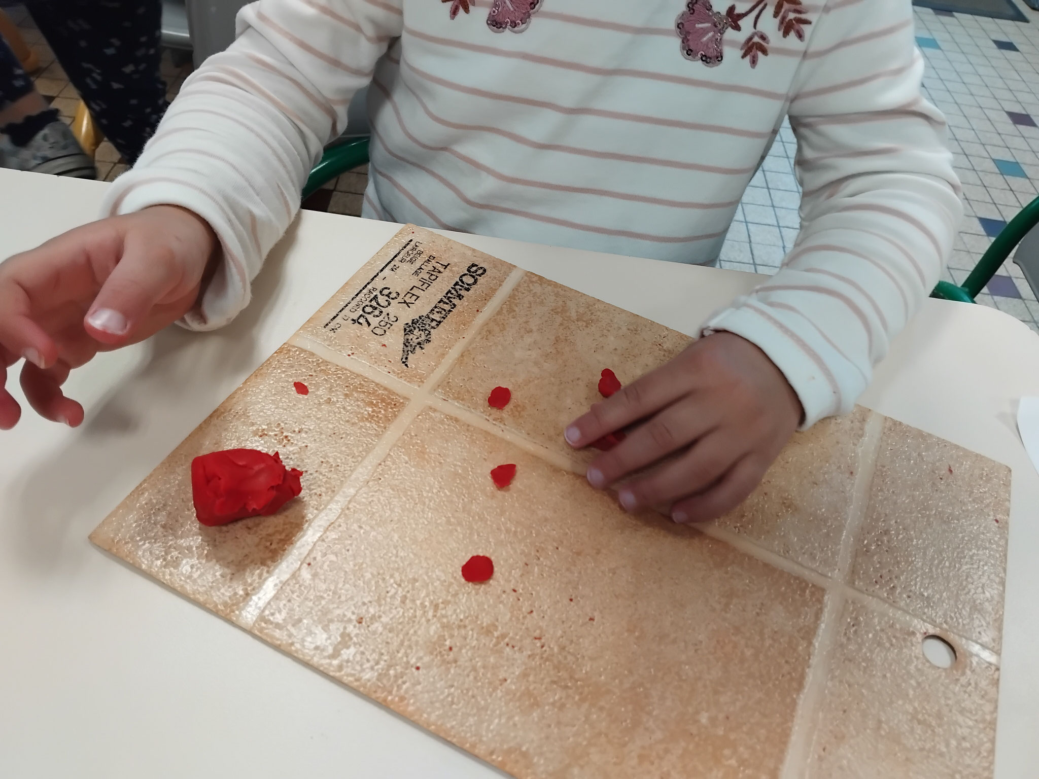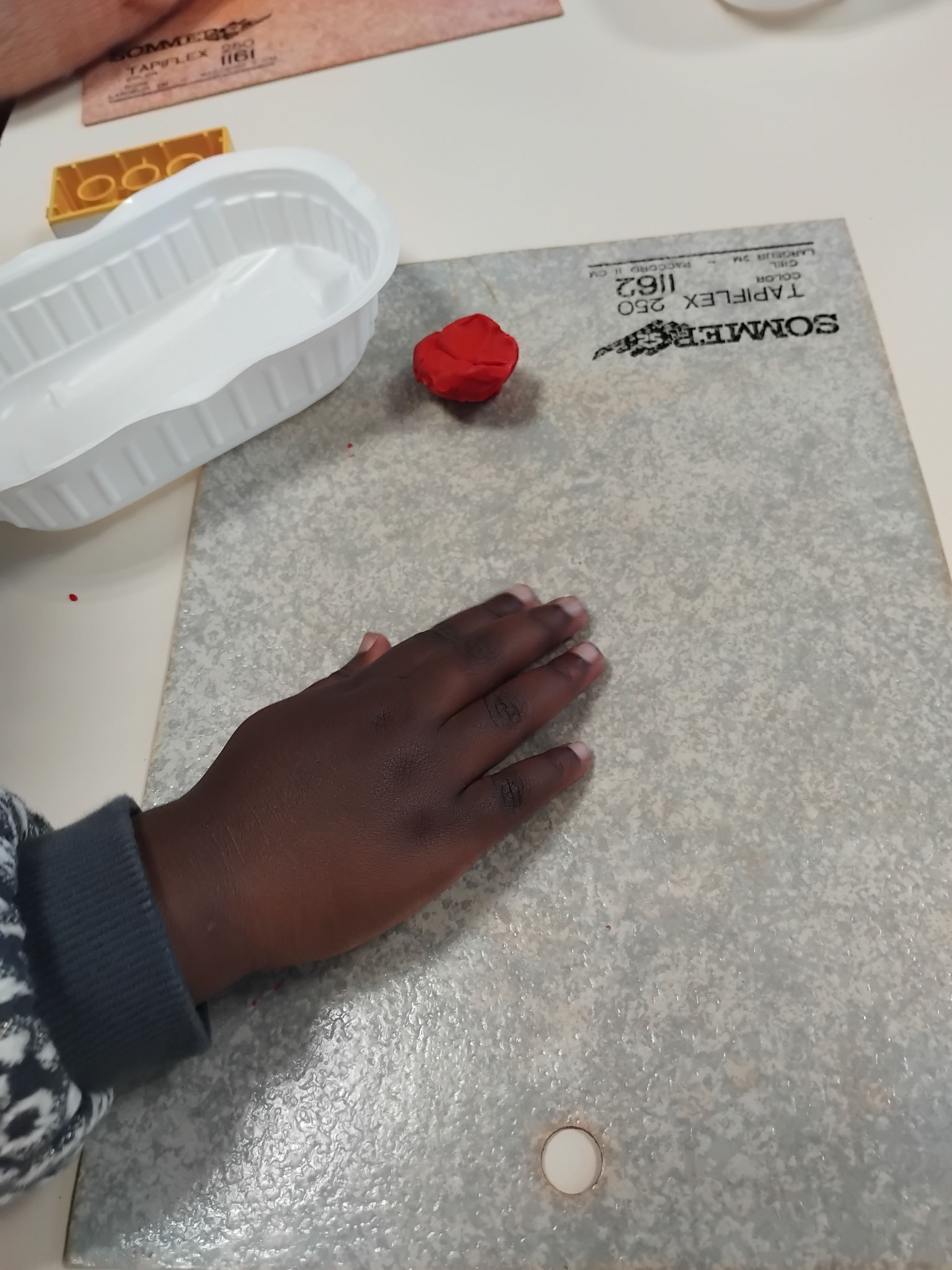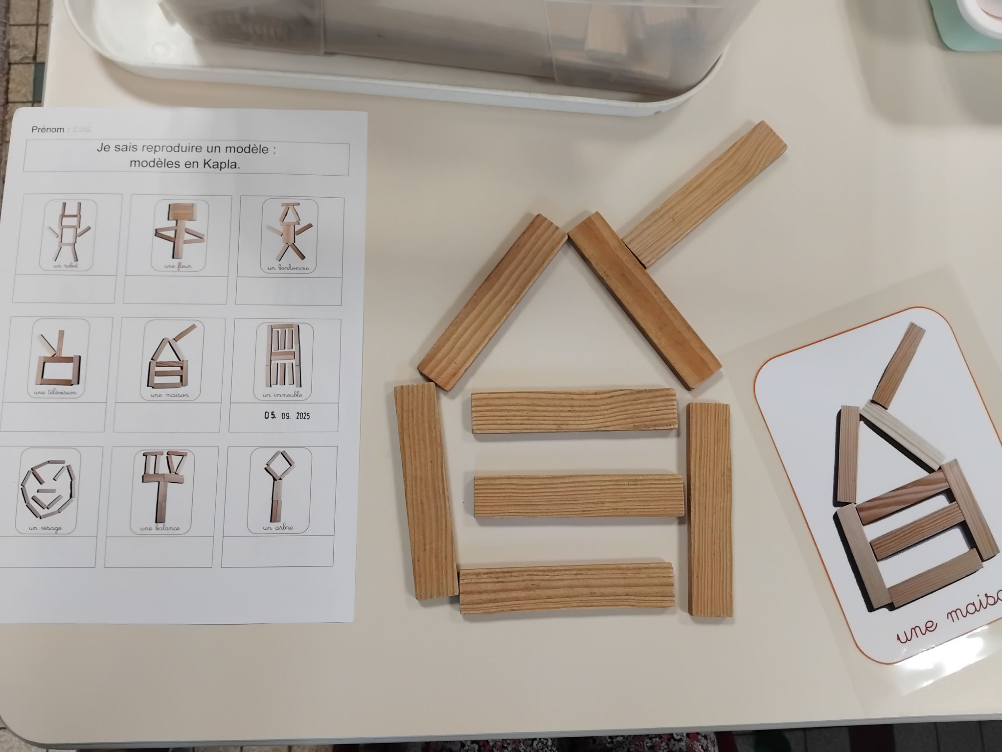 Au programme (entre autres) ce jour : apprendre à réaliser une boule en pâte à modeler (PS) pour muscler sa main et travailler la motricité fine, travail de la quantité "1" '(1 animal dans 1 enclos - PS), reproduction d'un modèle en Kapla (MS)...