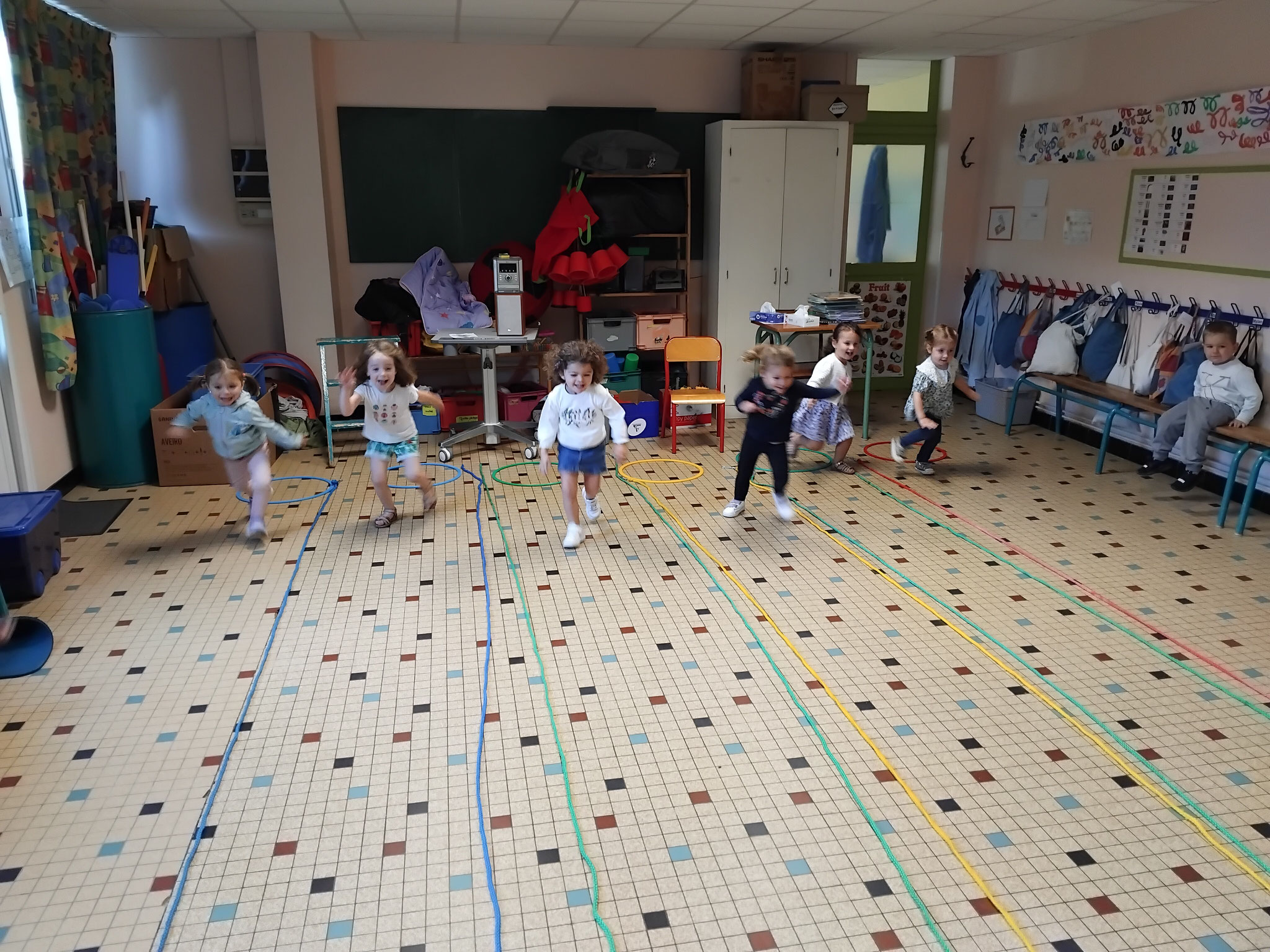 Cette semaine, nous avons travaillé (entre autres choses) la course en PS-MS, avec notamment cette contrainte de ne courir qu'au signal (puis également de rester dans son couloir : pas facile pour tout le monde ;-)