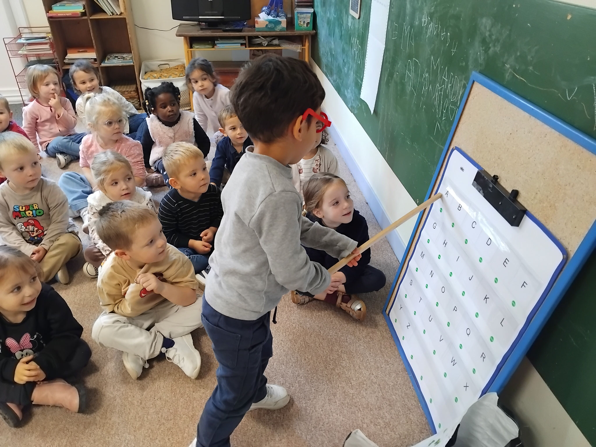 - Le rituel de "l'ophtalmo" où un élève de MS doit, à l'aide du tableau sonore, trouver et désigner la bonne réponse (ici des lettres majuscules en capitales d'imprimerie).