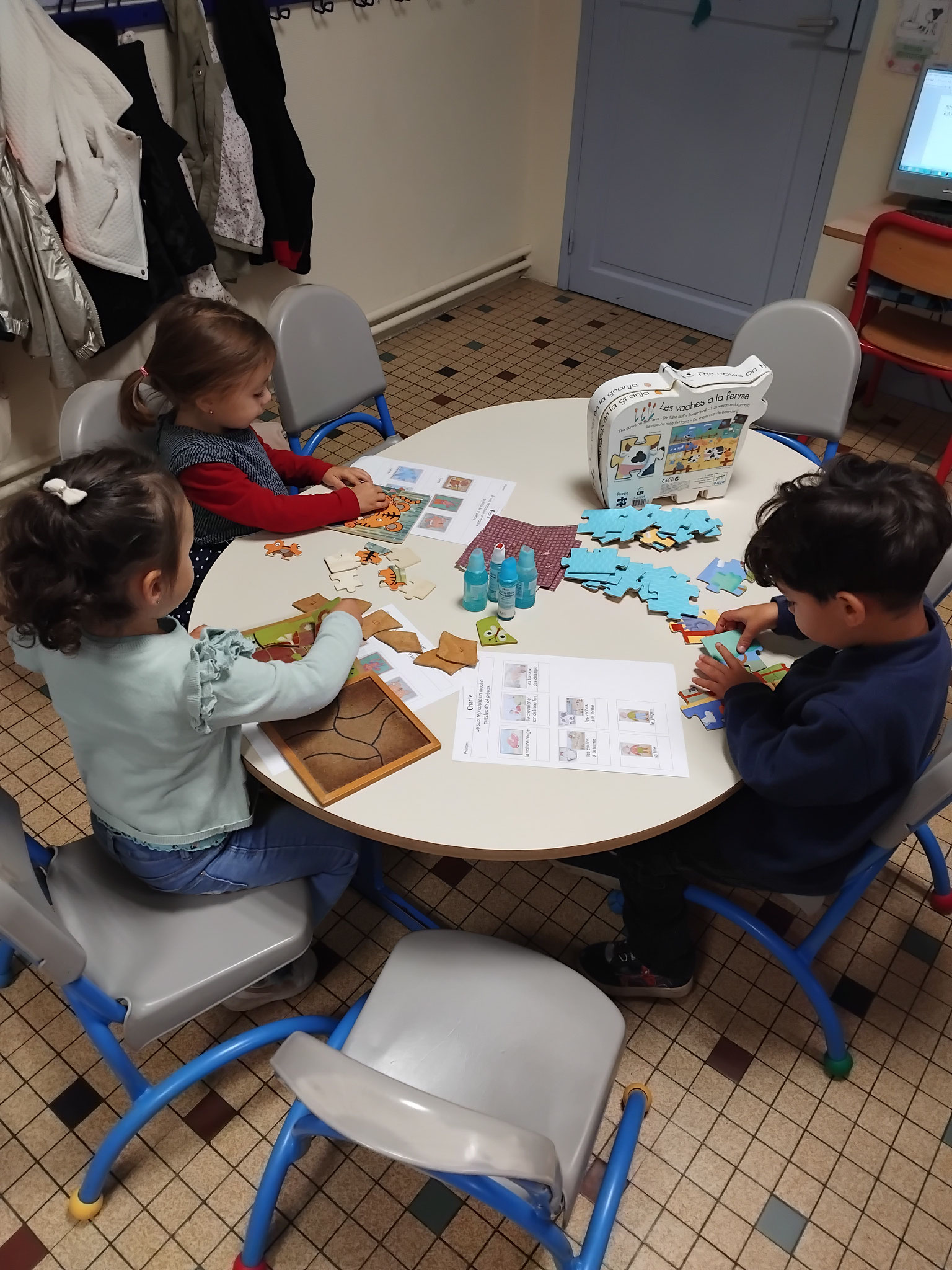 2ème jour d'école et tout va bien : découverte de l'espace "écriture" de la classe, atelier pâte à modeler avec Christine et les PS, "défi puzzle" avec les MS...